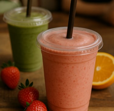 Utilizamos solo frutas 100% naturales y frescas, sin aditivos ni conservantes, proteína en polvo (en algunos), proteina natural (maní, banano, avena, etc) leche (opcional) 100% de vaca o deslactosada , desintoxicantes, algunos endulzantes naturales (panela, miel), etc